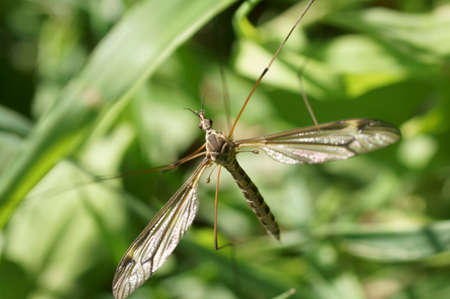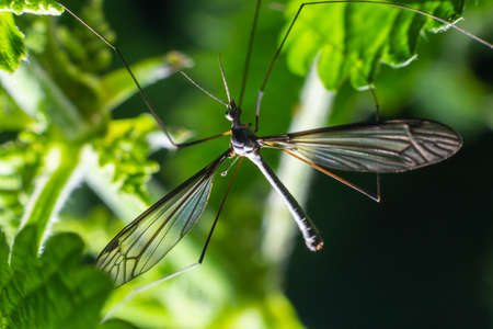 Macro close up of a crane fly Tipulidae resting on a bright green leaf. Detailed view of long legs, body and wings of the insect in natural habitat, symbol of biodiversity and entomology study.