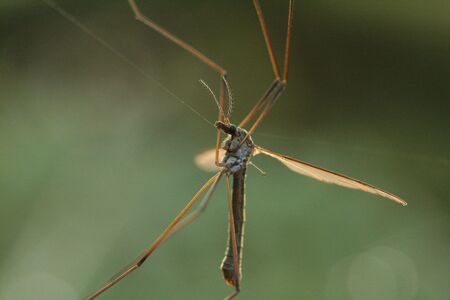 mosquito on a blurred green background. colorful detailed macro photo of an insect. screensaver. wildlife. close-up. text space. Tipulidae. Nematocera. Tipulidae. Tipula. mosquito.