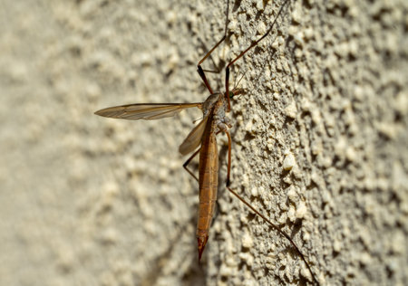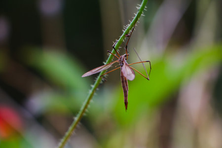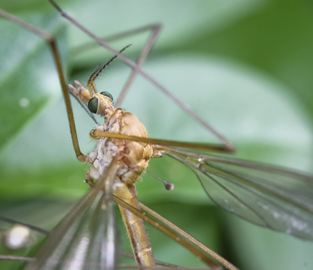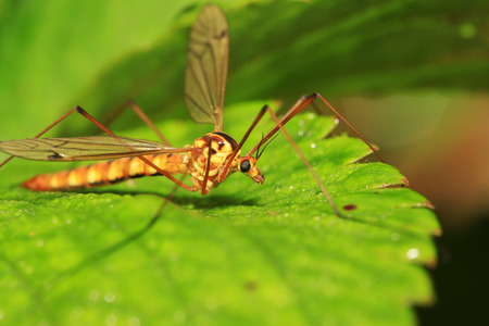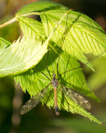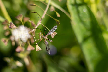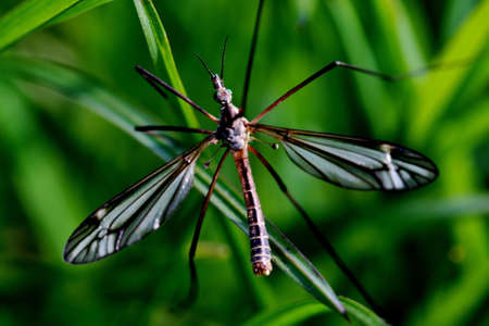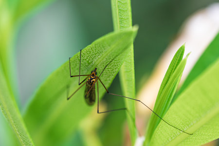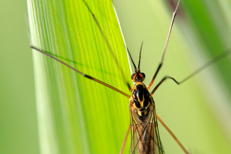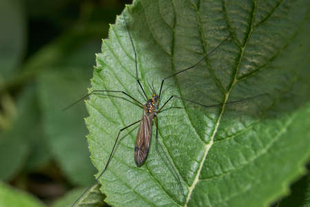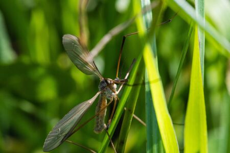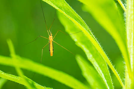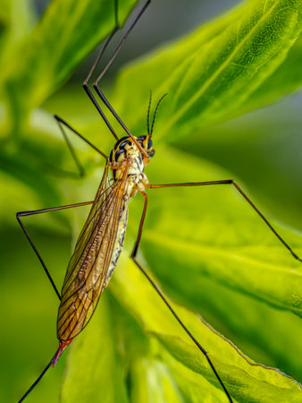 Macro close up of a crane fly Tipulidae resting on a bright green leaf. Detailed view of long legs, body and wings of the insect in natural habitat, symbol of biodiversity and entomology study.