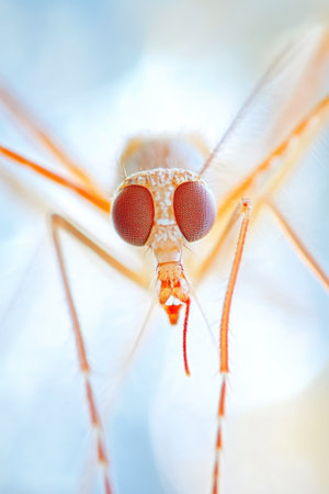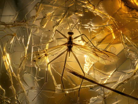 This captivating close-up photograph captures the intricate details of a long-legged mosquito resting on a vibrant flower The insect's delicate wings, elongated legs, and proboscis are showcased against a vibrant floral backdrop, while the bright yellow stamen adds a touch of luminosity This image offers a glimpse into the unique features and structure of this intriguing insect, revealing the intricate beauty hidden within the natural world AI Generative