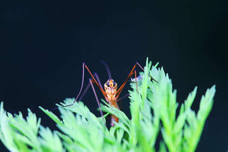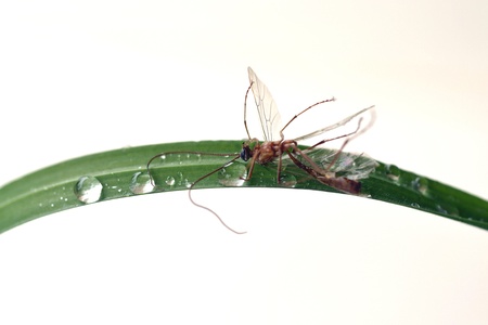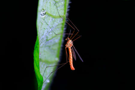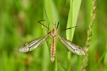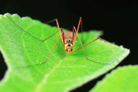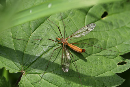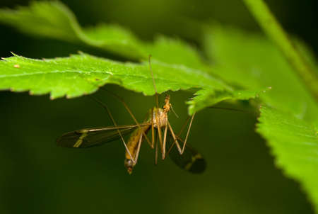 A female mosquito nephrotoma with long legs hid under a leaf of grass