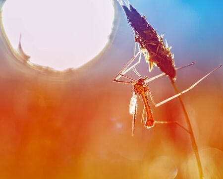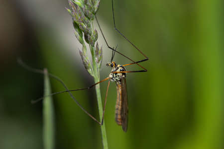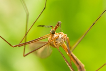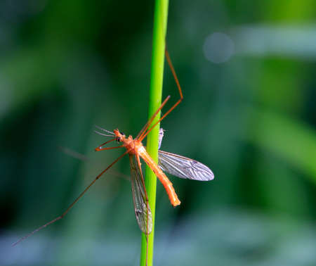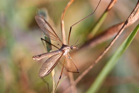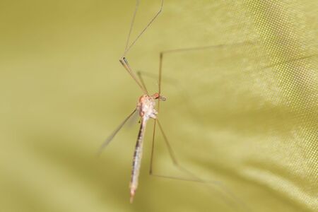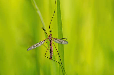 mosquito on a blurred green background. colorful detailed macro photo of an insect. screensaver. wildlife. close-up. text space. Tipulidae. Nematocera. Tipulidae. Tipula. mosquito.