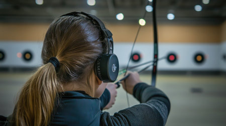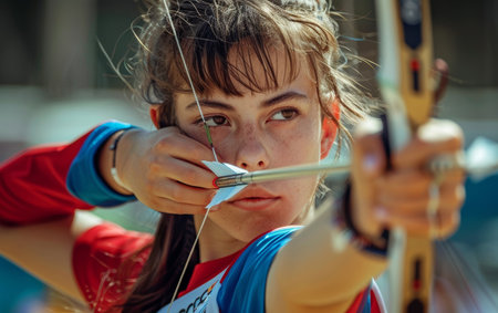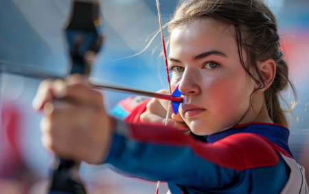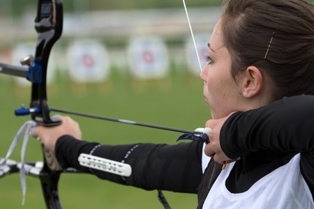 Close-up of a determined young woman archer drawing her bow in competition