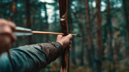 Archer prepares to release an arrow from a handcrafted bow amid tall trees, capturing the essence of traditional archery in a tranquil forest atmosphere.