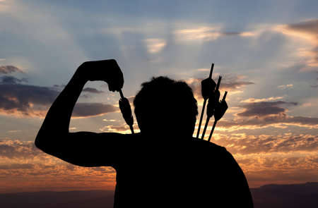 Close up of someone practising archery against landscape with sunset
