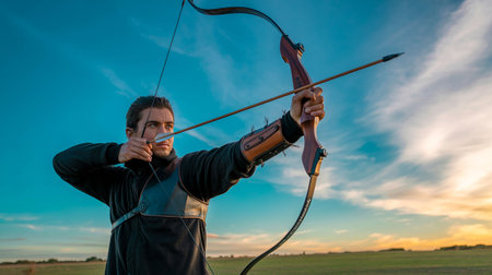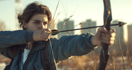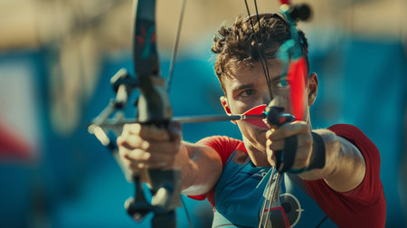 Caucasian male archer aiming a bow and arrow with intensity. Concept of archery, precision sport, focus, determination.