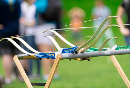 Archery equipment in the park, close-up. Archery competition