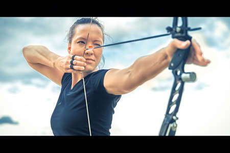 Archery woman bends bow archer target narrow .