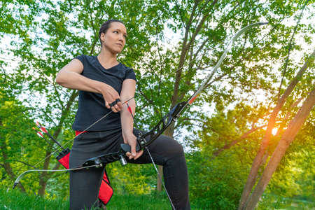 Archery sport. Athlete shooting with bow and arrow in the nature