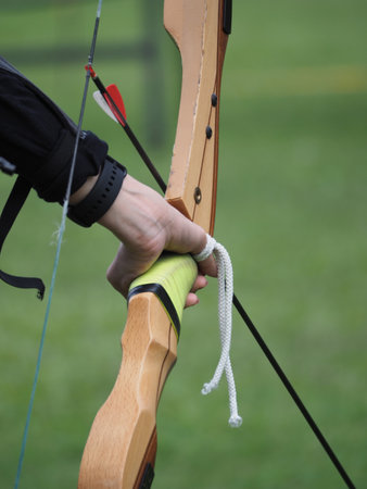 Archer s focused precision close up of hand drawing bowstring in summer olympic games sport