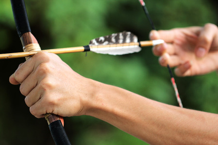 Archer hands close up, preparing the arrow for the shot.