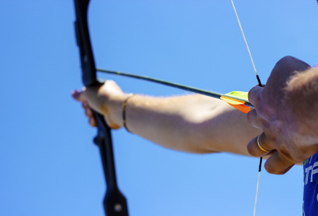 detail of a woman training shooting with a bow.
