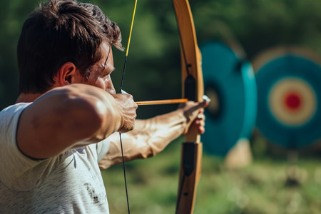 Skilled archer prepares to release arrow at target while showcasing concentration and technique outdoors.