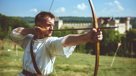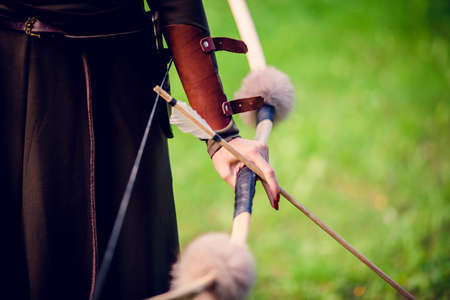 Caucasian male archer in medieval attire aiming a bow outdoors. Concept of archery, historical reenactment, medieval archer, traditional hunting.