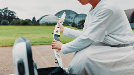 Hands, archer and bow for training, field and preparing for competition, equipment and outdoor for game. Archery, athlete and practice from tournament, skills and challenge for person in Japan
