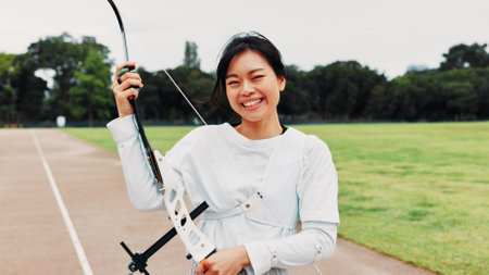 Woman, portrait and athlete for archery training at academy, outdoor exercise and weapon. Female person, shooting challenge and field for competition games, learning and practice with tool in japan