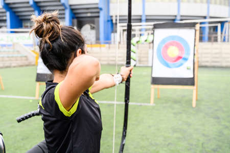 Young woman in wheelchair practicing archery outdoors.