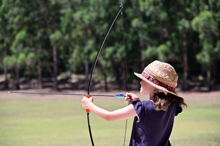 Side view of young girl (female age 07-08) archer aiming to target.