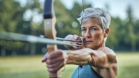 Mature white woman practicing archery outdoors. Concept of archery, sport, focus, senior athlete.
