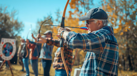 senior woman with bow and arrow aiming archery in autumn park.ai generated