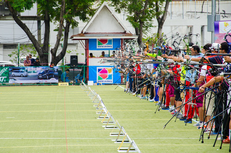 BANGKOK -MARCH 19: Unidentified archers in a row and shootin 2015 Asia Cup-World Ranking Tournament (stage II) at Hua Mak Sports Complex on March 19, 2015 in Bangkok, Thailand.