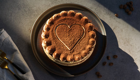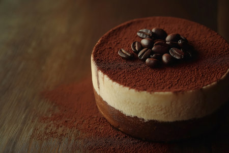 Round tiramisu cake covered with cocoa powder and decorated with coffee beans, placed on a wooden table, creates an inviting and indulgent scene