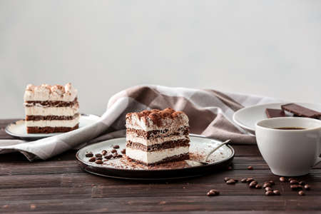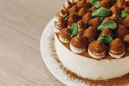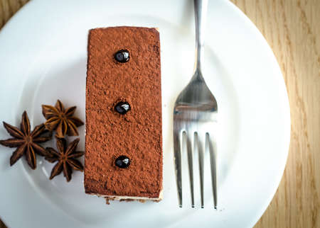 Tiramisu cake with chocolate decotaion on a plate. Wooden background. Close up.