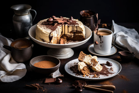 Tiramisu cake made from the chocolate and white sponge. A piece of dessert on wood, generative AI