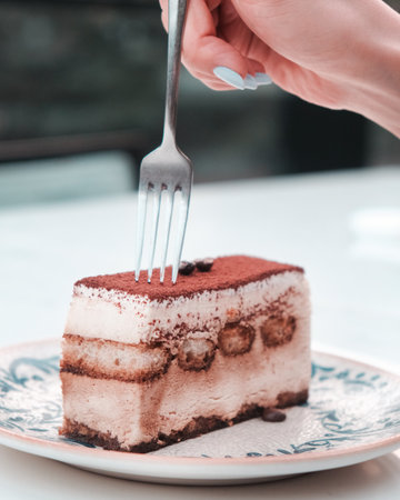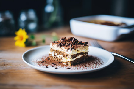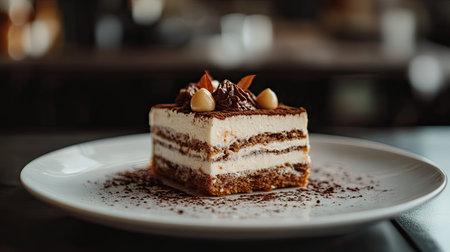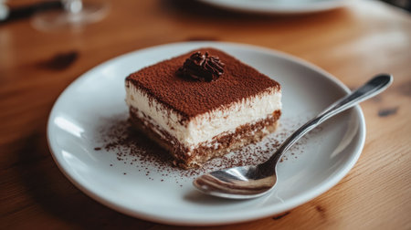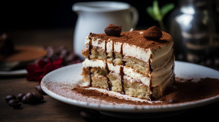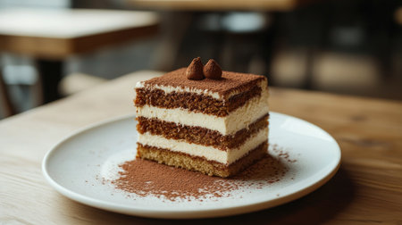 A delectable slice of tiramisu cake elegantly placed on a white plate, showcasing rich layers of cream and cocoa, perfect for dessert lovers.