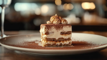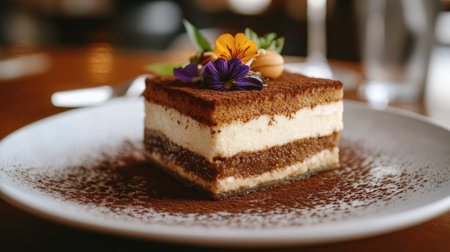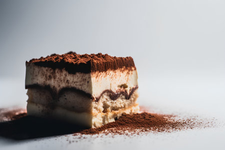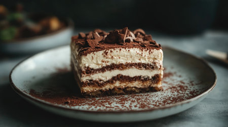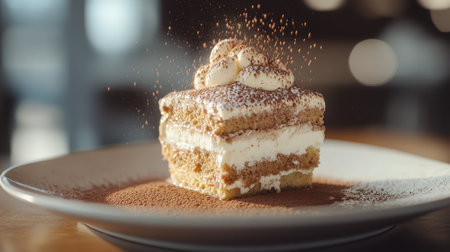 Discover an artistic view of a delicious tiramisu dessert, featuring creamy layers and a dusting of cocoa, presented elegantly on a plate. Perfect for food lovers.