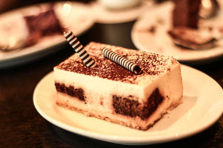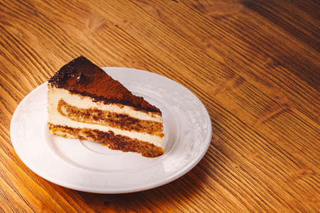 A piece of tiramisu cake on a white dish. Traditional italian dessert
