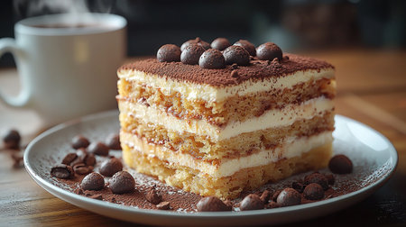 A decadent slice of layered tiramisu on a plate, garnished with cocoa, chocolate pearls, and coffee beans. A steaming mug of coffee sits in the cozy, soft-focus background.