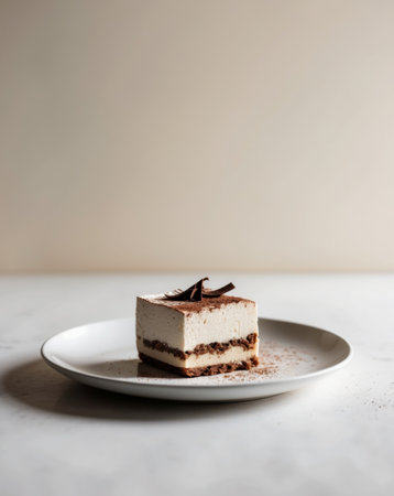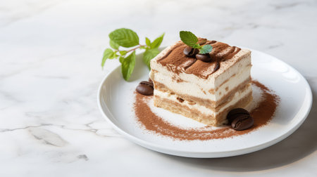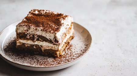 A delectable Tiramisu dessert on a white plate, set against a neutral background, allowing for plenty of copy space, perfect for showcasing the rich layers of coffee and mascarpone cream.