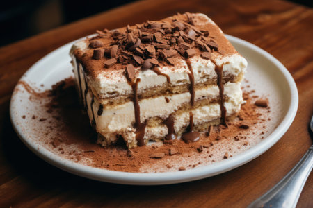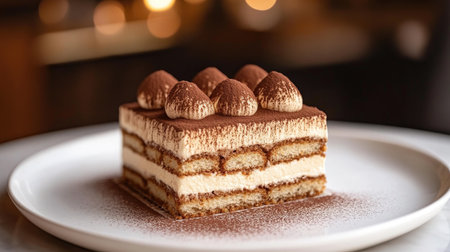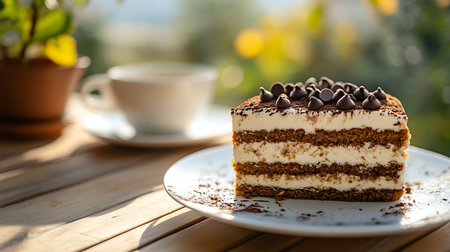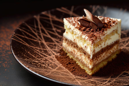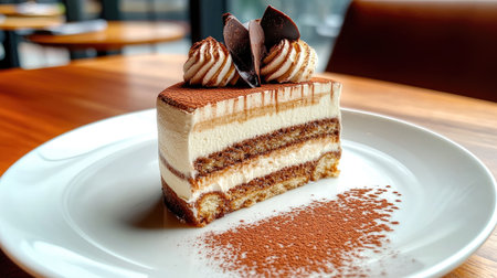 This beautiful slice of tiramisu showcases layers of creamy coffee flavor, elegant chocolate decorations, and is perfect for dessert lovers in a caf