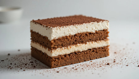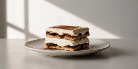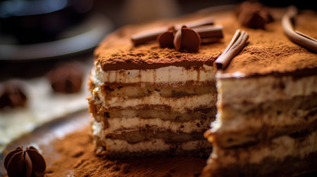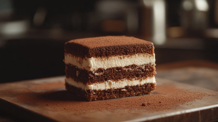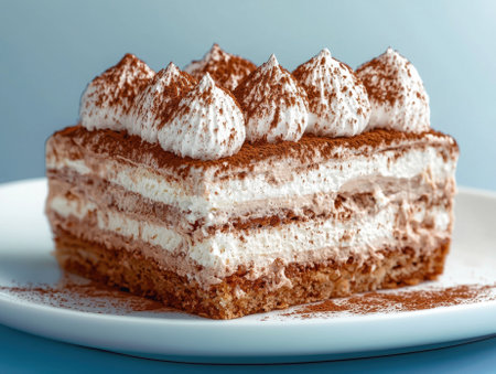 Close-up of a slice of decadent tiramisu with layers of coffee-soaked ladyfingers and mascarpone cream, dusted with cocoa powder
