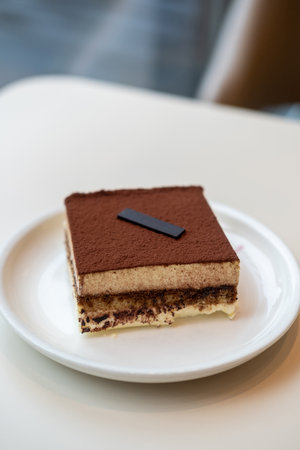 Slice of tasty chocolate tiramisu on white plate on table in cafe. Traditional Italian biscuit dessert or cake.