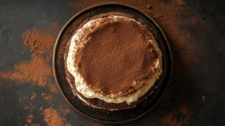 High-definition top view of a gourmet tiramisu cake with layers of coffee-soaked sponge and mascarpone cream, beautifully dusted with cocoa powder.