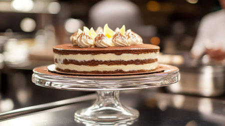 This image showcases a delicious tiramisu cake elegantly placed on a glass stand, highlighting its creamy layers and rich chocolate topping, perfect for dessert lovers.