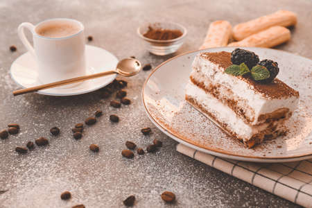 A close-up of Tiramisu on a white plate, highlighting the creamy mascarpone and layered biscuits, served alongside a cup of coffee, all presented on a stylish gray concrete background.