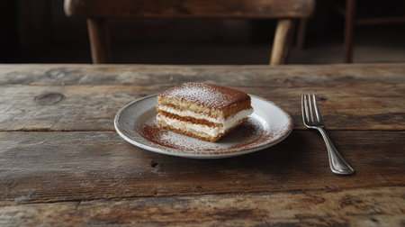 A delectable slice of tiramisu cake served on a rustic plate, showcasing layers of creamy goodness and a dusting of cocoa. Perfect for dessert lovers.