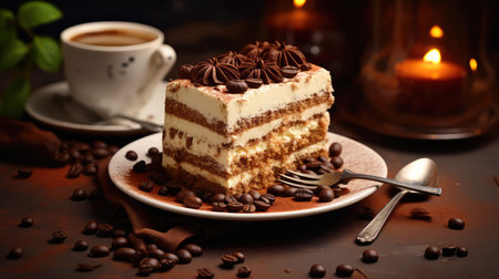 An indulgent, delicious tiramisu layered dessert that is expertly topped with cocoa and surrounded by rich coffee beans. Generative AI