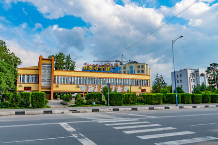 Penjikent Restaurant Cafe Dusti Picturesque View at Rudaki Avenue Prospekt on a Cloudy Blue Sky Day