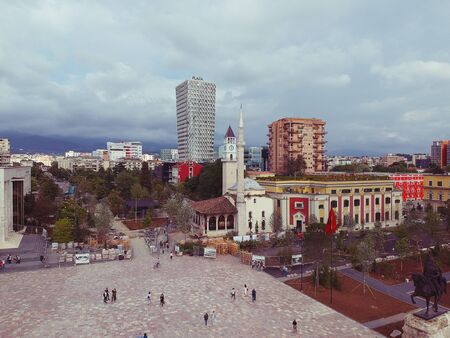 TIRANA, ALBANIA, SEPTEMBER 29, 2019: People are strolling in front of the Skanderbeg memorial and Ethem Bey mosque in Tirana, Albania