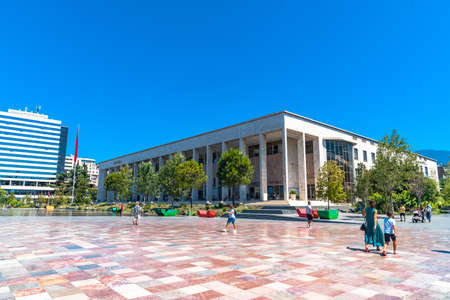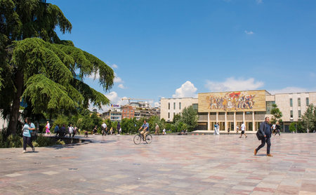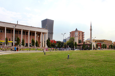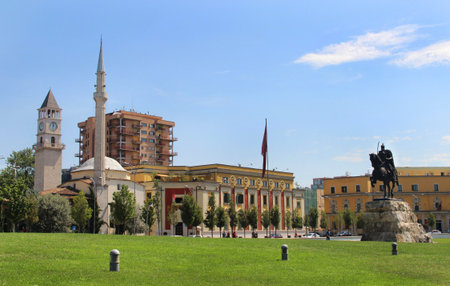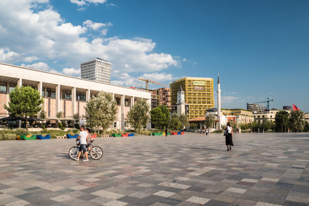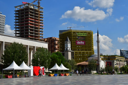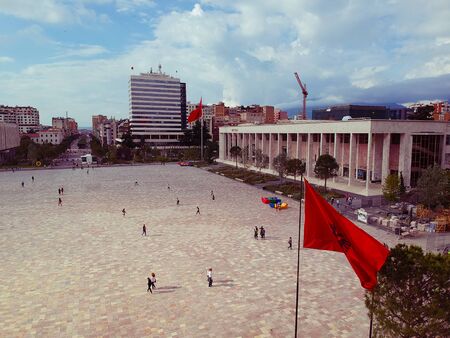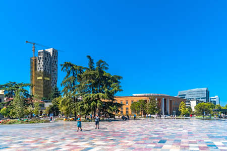 TIRANA, ALBANIA - AUGUST 9, 2018: The Skanderbeg Square is the main plaza in the centre of Tirana