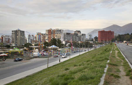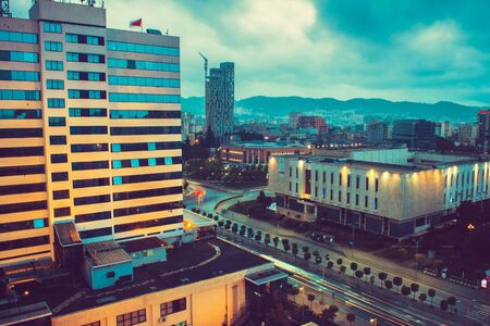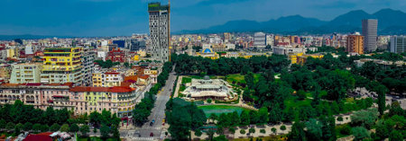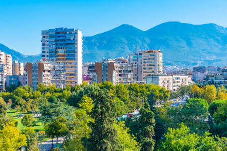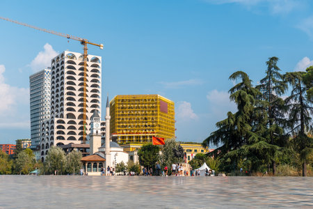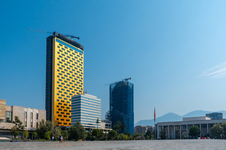 Urban development and modern architecture with tall buildings, city growth and contemporary skyline in Tirana, Albania