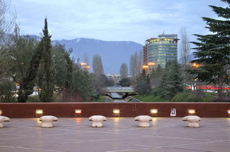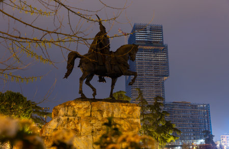 Evening photo of Skanderbeg Monument in Tirana, Albania