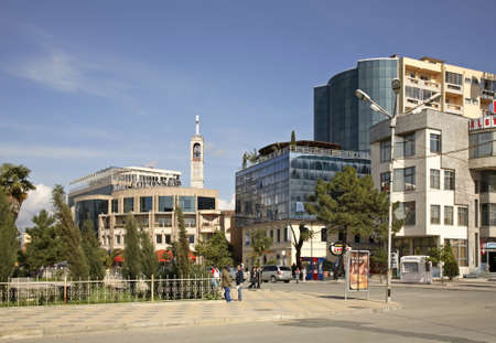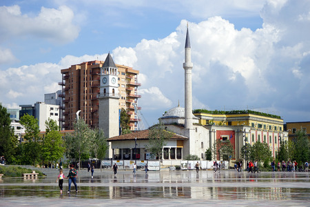 Skanderbeg square with mosque and clock tower in the center of Tirana city, Albania.