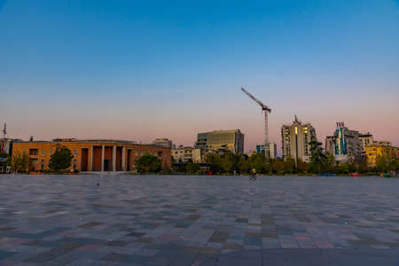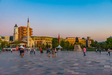 TIRANA, ALBANIA, SEPTEMBER 28, 2019: Sunset view of Skanderbeg memorial and Ethem Bey mosque in Tirana, Albania