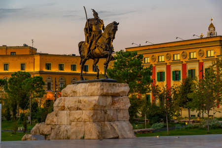 TIRANA, ALBANIA - February 5, 2023: Statue of Skanderbeg, Albanian national hero, at the sunset in the Skanderbeg Square in Tirana, Albania.