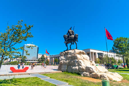 TIRANA, ALBANIA - AUGUST 6, 2019 : Skanderbeg monument and sculpture on Skanderbeg Square. This is in capital of Albania.